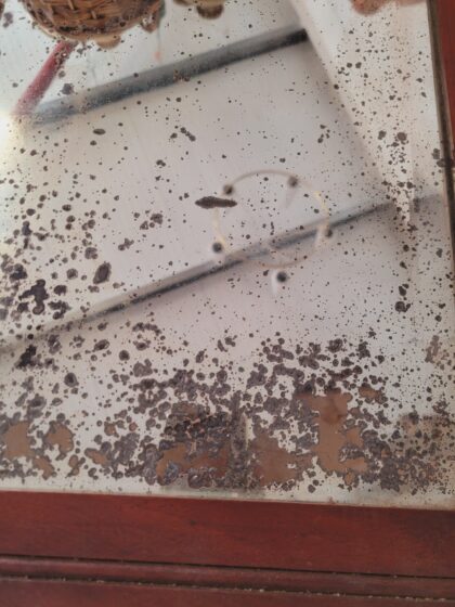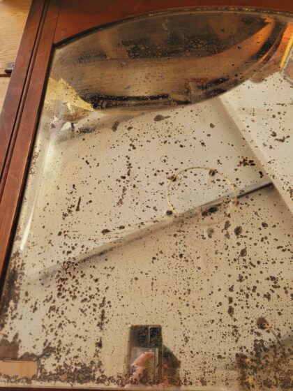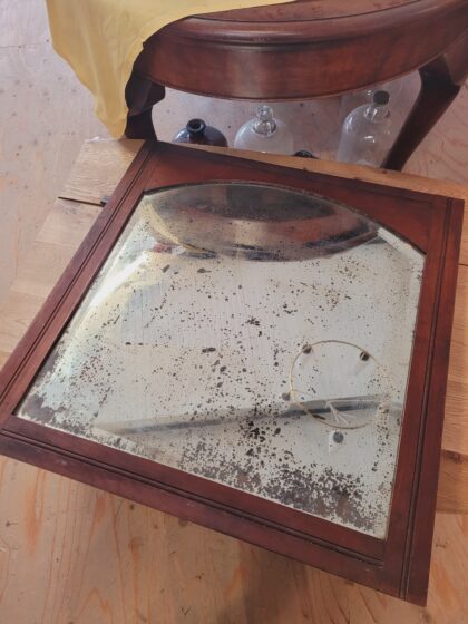 An Edwardian, wooden framed mirror. The mirror features spotting and some of the backing has come completely away in some spots.