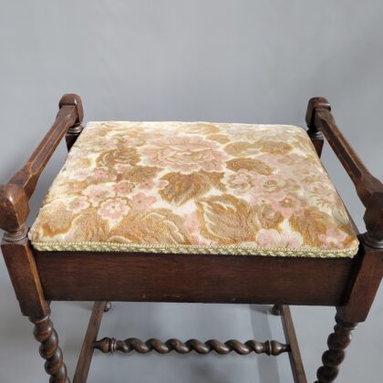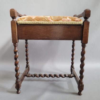 An Edwardian oak piano stool with barley twist legs. The seat pad lifts up to reveal a small storage compartment for sheet music.