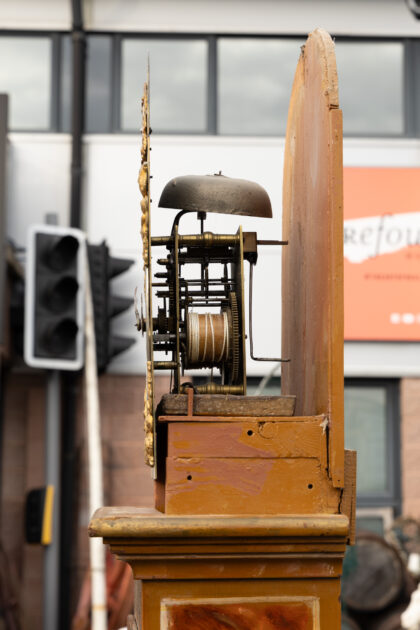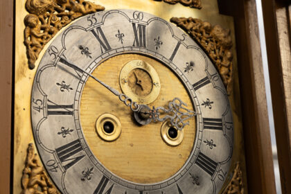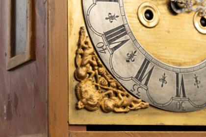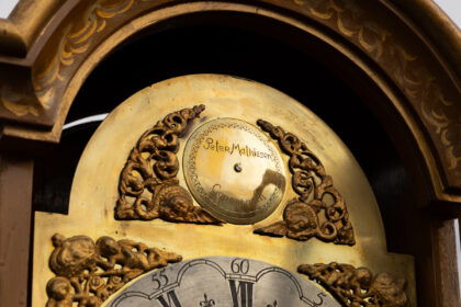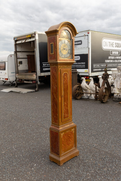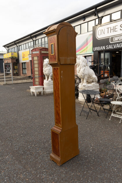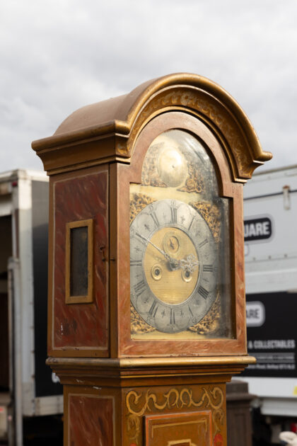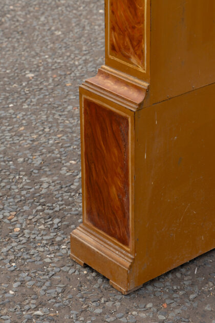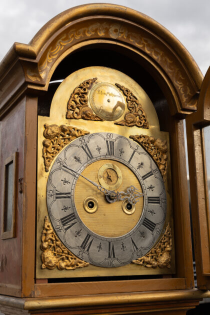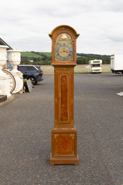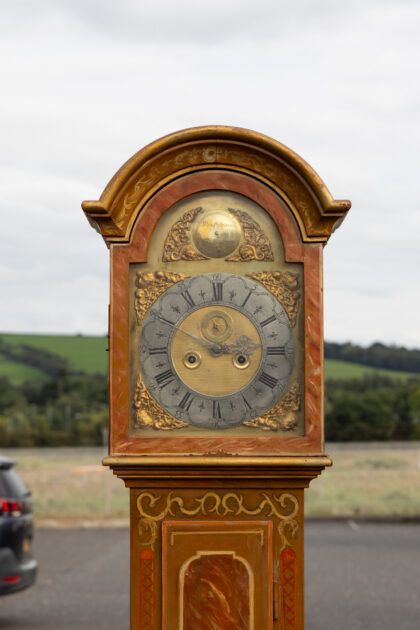 Edwardian hand painted pine grandfather clock with brass and silvered dial by Peter Mathiesn Copenhagen.