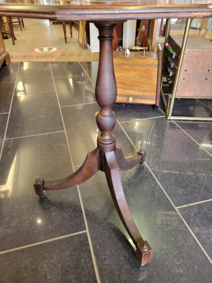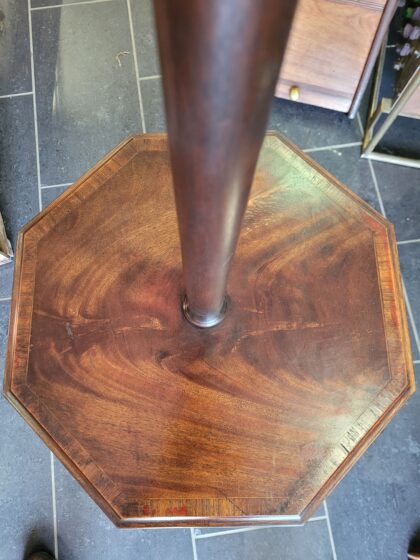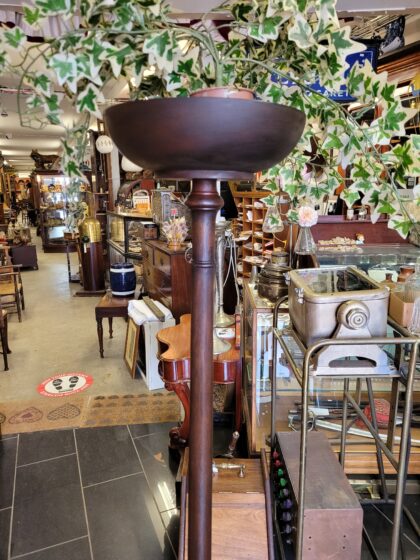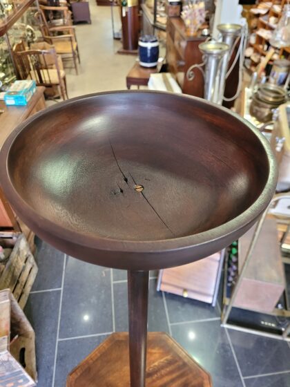 An Edwardian wooden piece of furniture. This is a standing pole with a shelf and a small bowl on top. Could be used as a table.