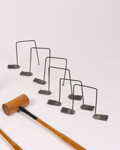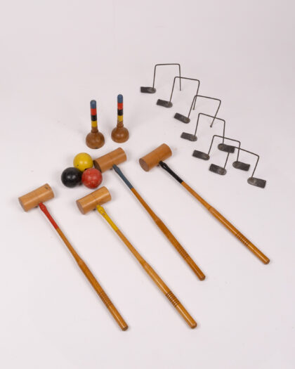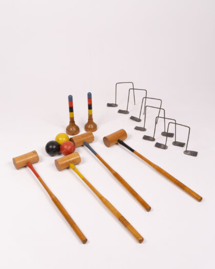 Vintage croquet set with four mallets, wickets, and balls. A classic outdoor game for family fun.