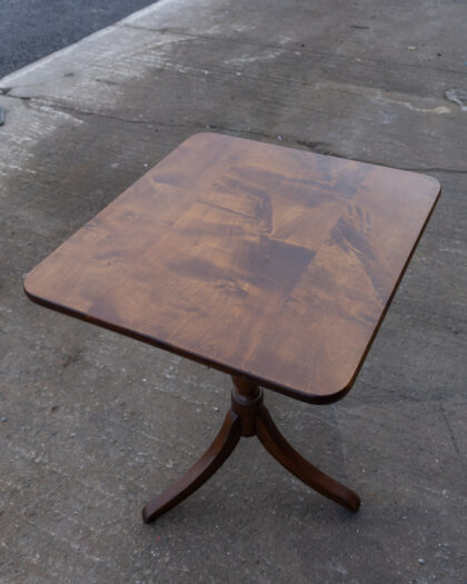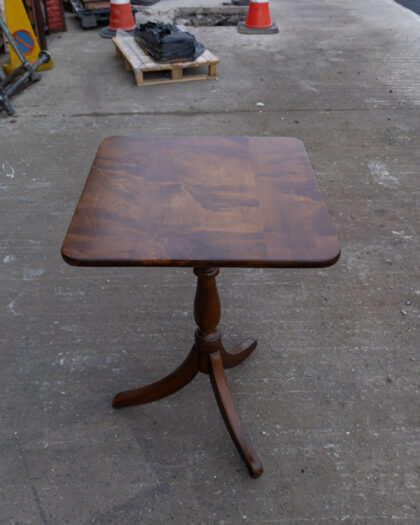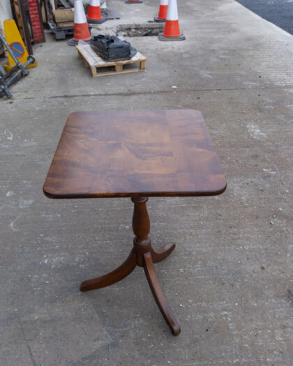 This Edwardian side table is crafted from wood with a rich brown finish. The design features a square tabletop and a decorative pedestal base with curved legs. This table would be a perfect addition to a living room, bedroom, or hallway, providing a stylish surface for lamps, books, or decorative items. Table is in good vintage condition with some signs of wear. No markings or brand identified.