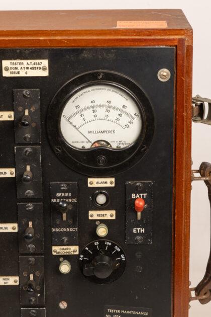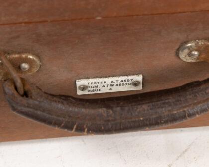 Vintage Electrical Instruments Ltd. A.T.4557 Tester, DGM. ATW 45570, Issue 4, housed in a sturdy wooden case with a leather carry handle. Features include multiple knobs and switches for adjusting settings and a Milliamperes meter for readings. Includes a Calibration sticker dated 21-1-83. Tester Maintenance No. 1024 Cal Date 7 is also visible. Sold as untested. Shows signs of age-related wear. The metal hardware shows some rust. The leather handle shows wear.