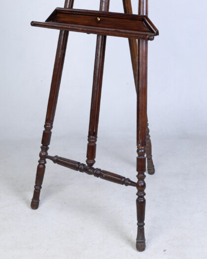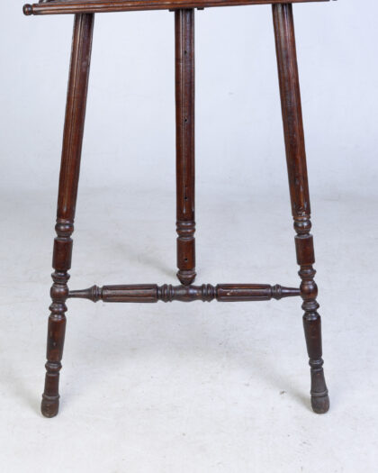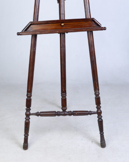 This is a wooden easel, styled in the French manner. It has three legs, with decorative features at the top. It has a tray in the middle for storing materials. It has a wooden brace at the bottom of the legs. It has an aged appearance.