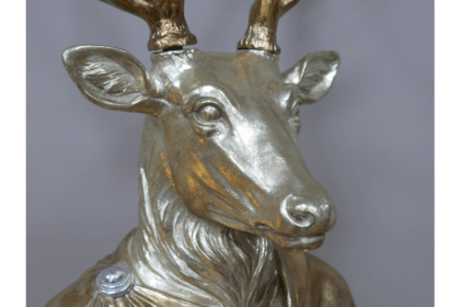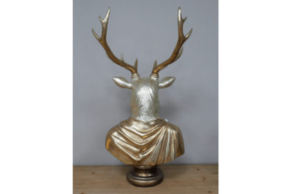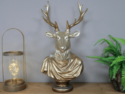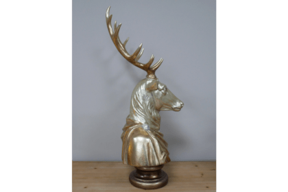 This stunning gold stag bust features an intricately detailed design, showcasing the majestic beauty of a deer. Mounted on a smooth wooden plinth, it adds a touch of sophistication and charm to any room. Perfect as a statement piece for your home decor.