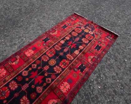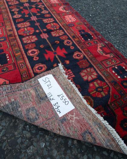 This exquisite handwoven Persian Hamadan runner features a full wool pile with intricate geometric and floral patterns in vibrant red and blue hues. Measuring 315cm x 113cm, this timeless piece includes woven signatures, adding a touch of authenticity and elegance to any interior space.