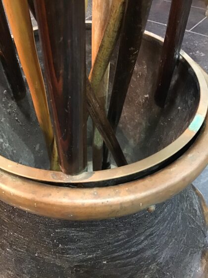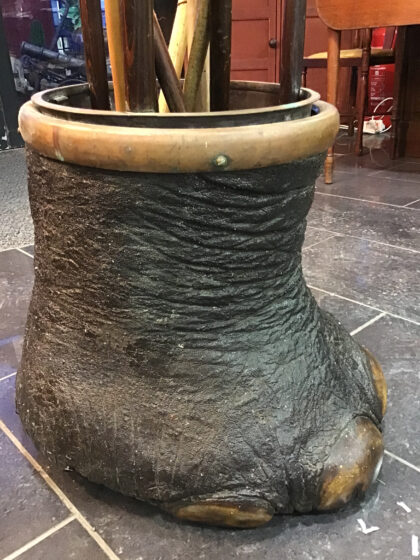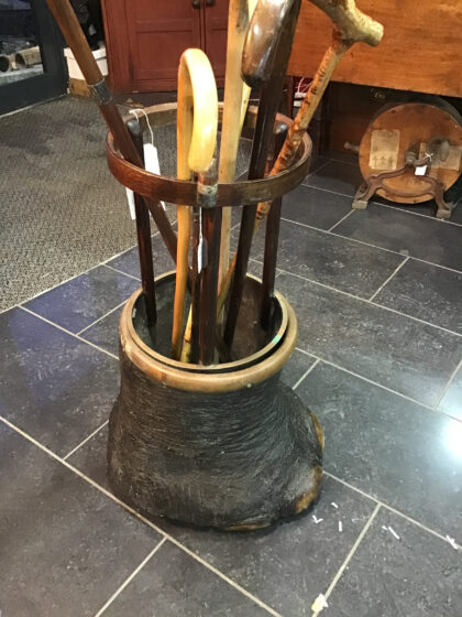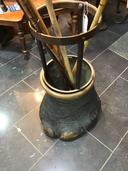 Elephant foot finished with a brass ring, completed with a brass insert and bentwood upper frame.