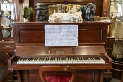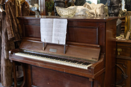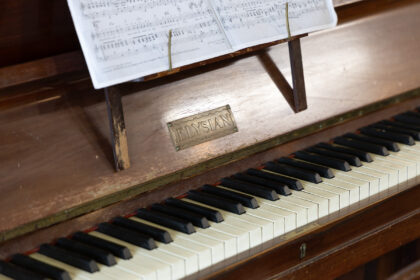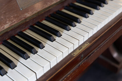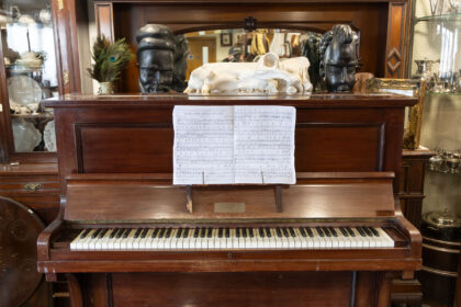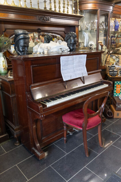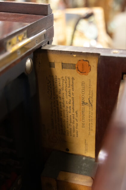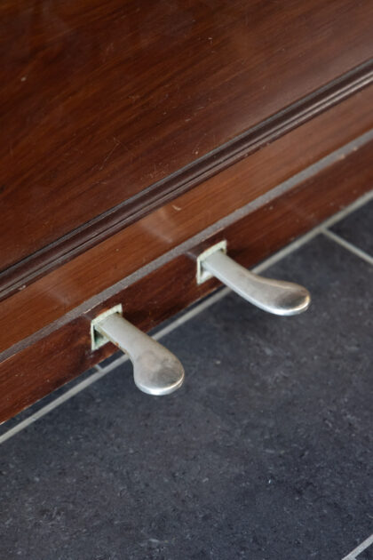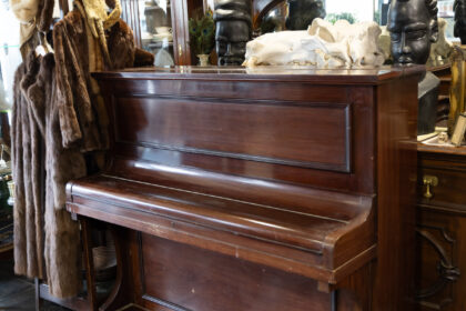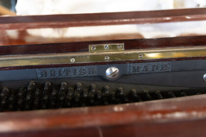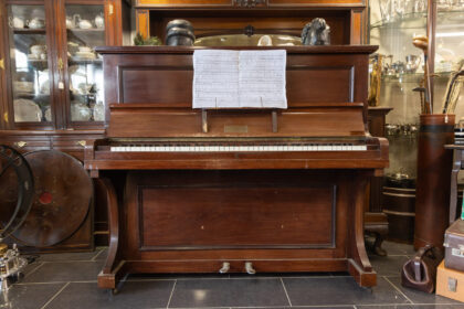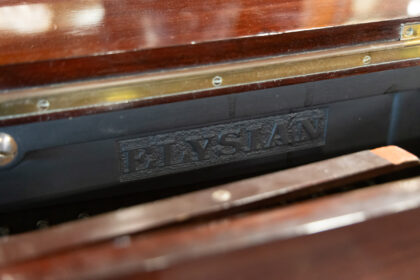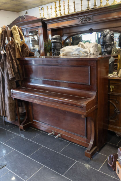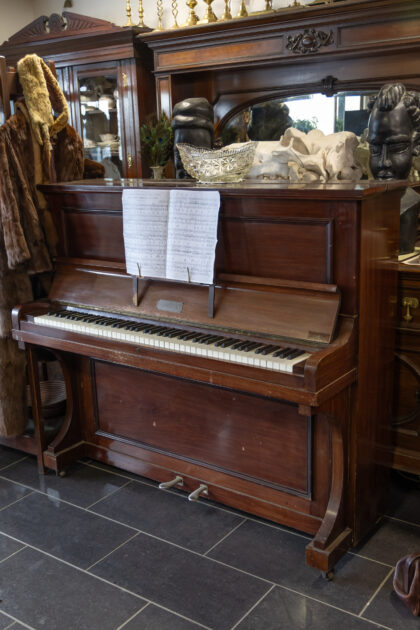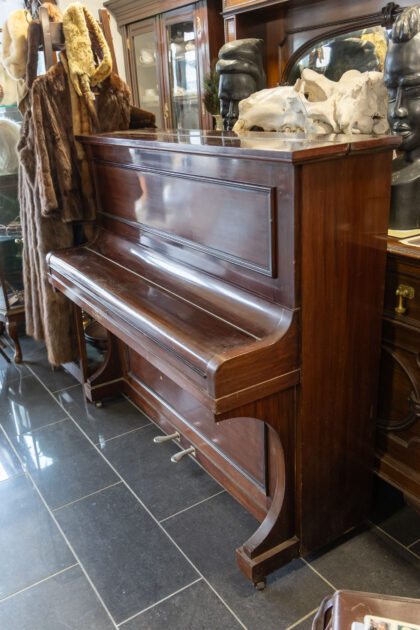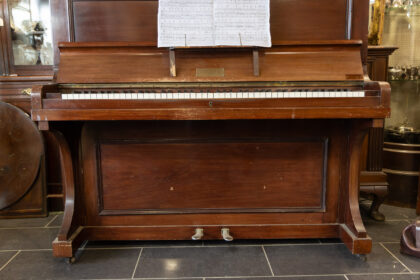 This is an Elysian British Made upright piano. The wooden frame is stained a dark wood shade and the keys are white and black. The piano has a sheet music stand and two pedals. This piano would make a lovely musical instrument or a statement piece in a home. Wear and tear is apparent to the item.