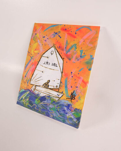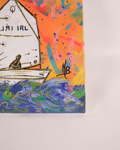 This is a brand new original acrylic painting on canvas by the artist Kate Broderick. The artwork features a sailboat on blue waves against an abstract orange sky with splashes of colour. The painting is signed by the artist. The colours are bright and vivid, and the canvas is stretched over a wooden frame, marked on the back. The painting is sized approximately 36cm in height and 28cm in width. This contemporary artwork will look striking displayed in a living room or home office.