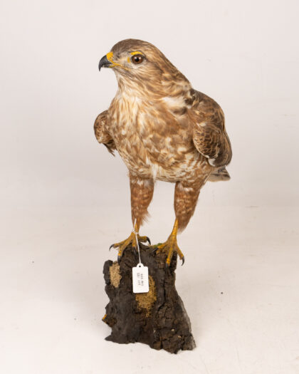 Taxidermy Eurasian buzzard perched on a natural wood base. Beautifully displayed female bird of prey. In good condition.