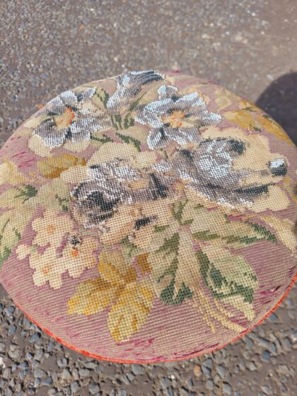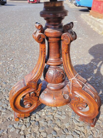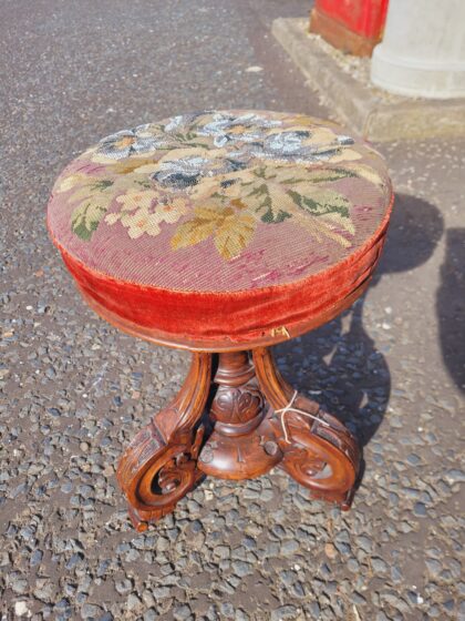 Victorian piano stool with very intricately carved base. On small castors. The plush seat top features cross-stitching and beadwork with red velvet sides.