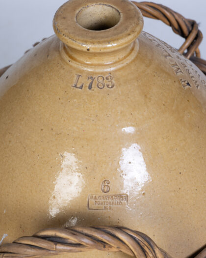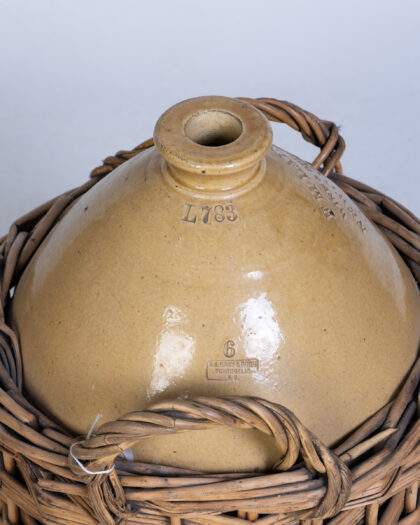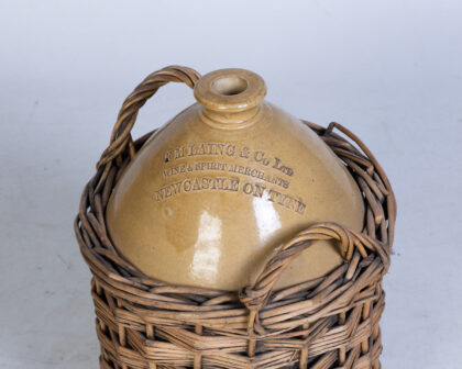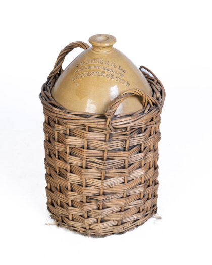 A vintage stoneware jar with a wicker basket holder. The jar is earthenware with the name of the company, F.M. Laing & Co Ltd Wine & Spirit Merchants Newcastle on Tyne, embossed on the side. The basket is woven wicker, and fits snugly around the jar. The jar is in good condition, with some discoloration on the surface. The wicker basket is also in good condition, with some wear and tear.