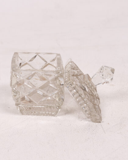 This is a beautiful, clear glass trinket box with a faceted design. The box features a square shape with diamond-cut patterns on all sides, adding to its decorative appeal. It comes with a matching lid, also intricately faceted, with a pointed finial on top for easy lifting. The glass is clear, allowing the contents of the box to be visible. The box is in good condition, perfect for storing small jewellery items, keepsakes, or other treasures. It would make an elegant addition to a dressing table, shelf, or any display area.