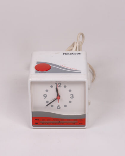 Vintage Ferguson clock radio. White plastic, red snooze button. Retro design. Untested.