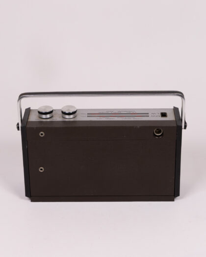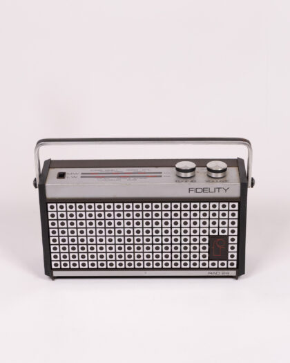 A Fidelity RAD 24 transistor radio. The radio features a silver and black finish with a handle. The front of the radio has a speaker grill with a grid pattern. It has tuning and volume dials. The back is brown with headphone and power jack sockets. Good condition. Untested.