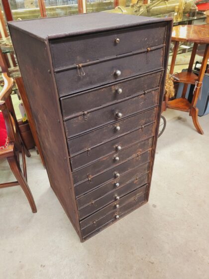 A black metal cabinet for storing 12 film reels.