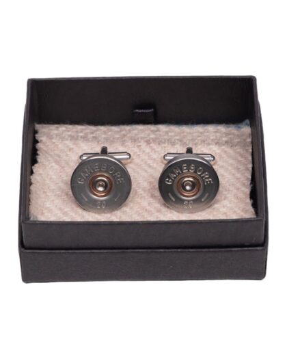These brand new cufflinks from Fine Feathers are crafted from metal and feature genuine Gamebore shotgun cartridge ends. The silver finish complements the brown and black details of the cartridge. They are presented in a stylish black presentation box, making them an ideal gift for the sportsman or country gent. Ideal for formal occasions or adding a touch of personality to everyday attire.
