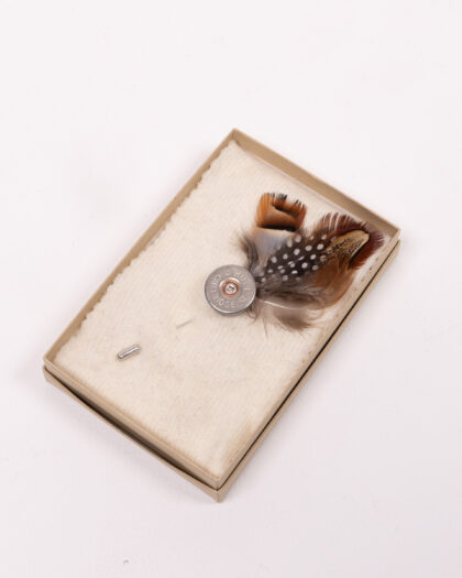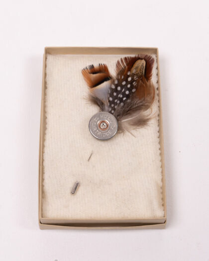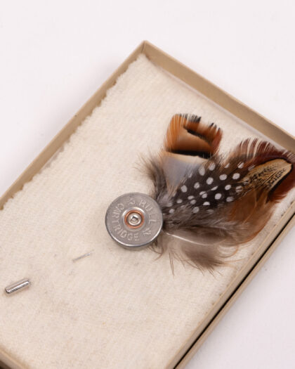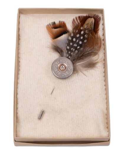 This brand new lapel pin from Fine Feathers features a silver metal shotgun cartridge design, beautifully accented with feathers. A unique and stylish accessory, this lapel pin would make a thoughtful gift or a distinctive addition to any collection. Ideal for adding a touch of personality to jackets, bags, or hats.