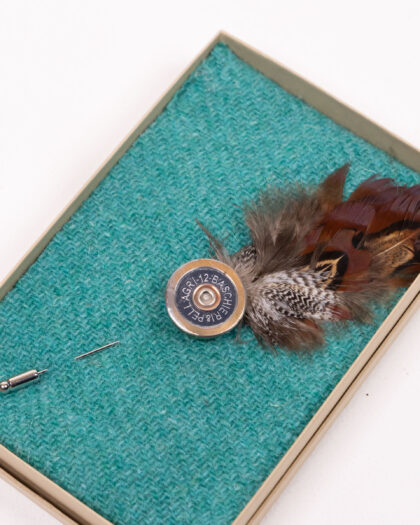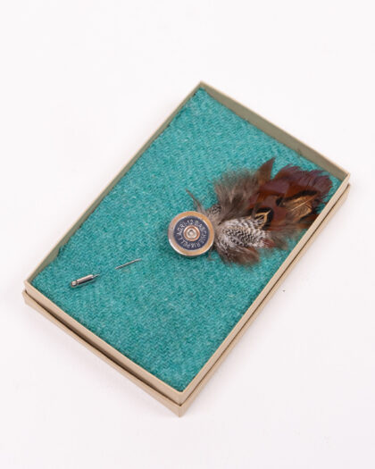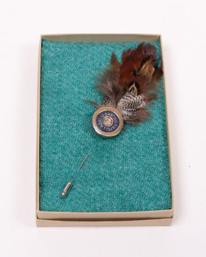Fine Feathers shotgun cartridge lapel pin, metal and feather detail. Ideal for adding a touch of quirky detail. Brand New with Box.