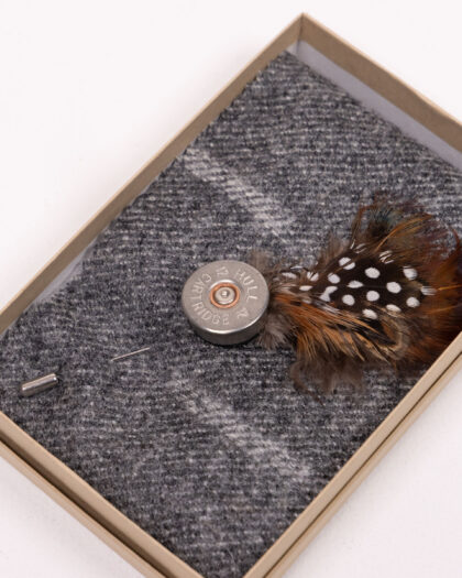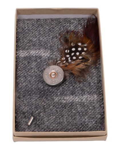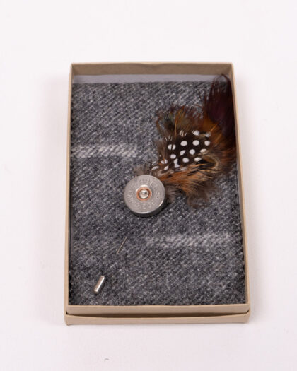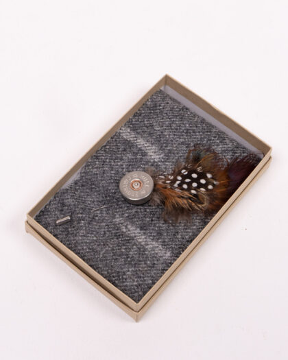This is a Fine Feathers shotgun cartridge lapel pin. The lapel pin features a realistic shotgun cartridge made from metal and brass. A feather detail adds a touch of natural style. This unique accessory is perfect for adding a touch of character to any outfit. It comes in a presentation box, ready for gifting.