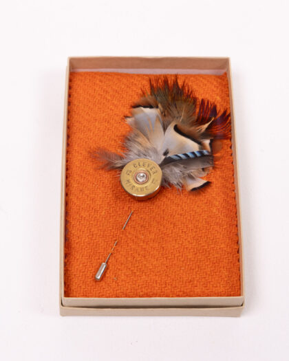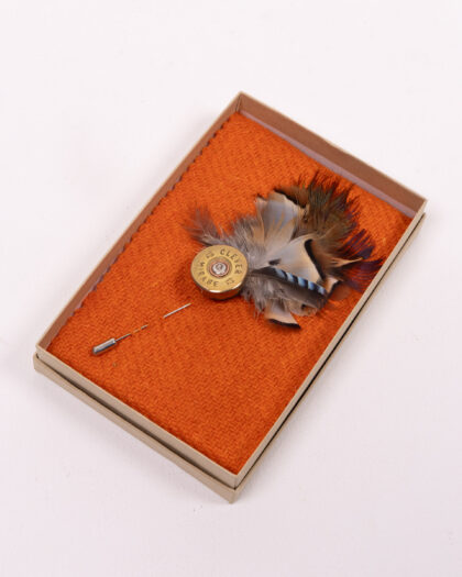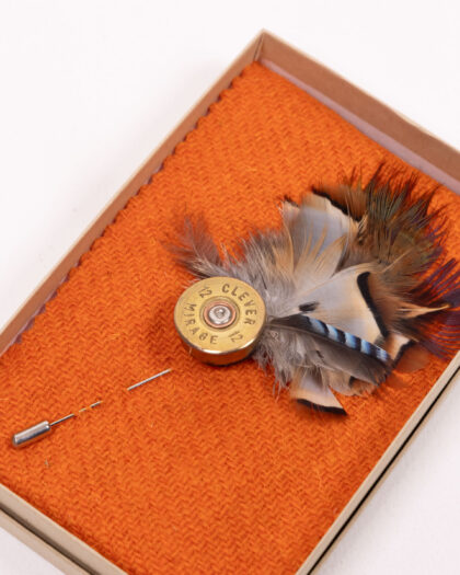 Brand New Fine Feathers lapel pin. Metal shotgun cartridge with feathers. Stylish pin to add detail to a jacket or outfit.