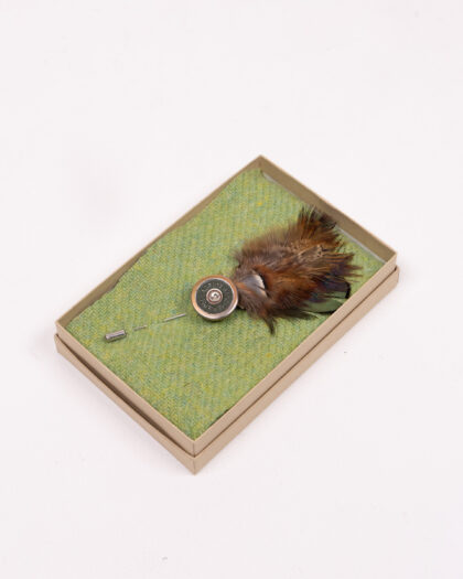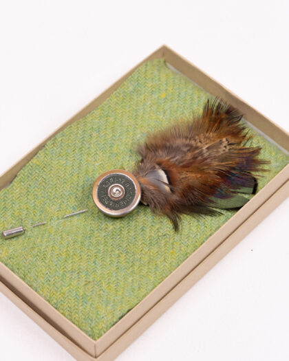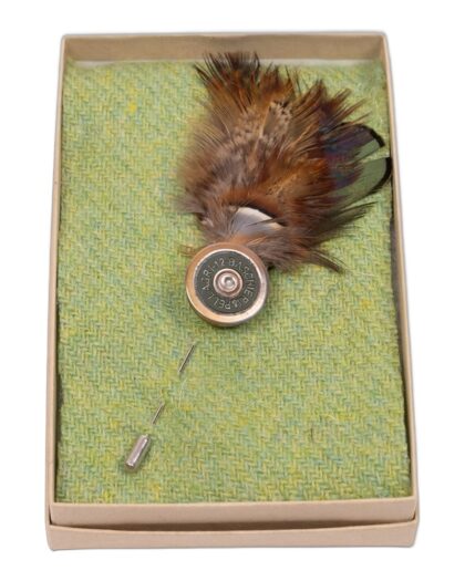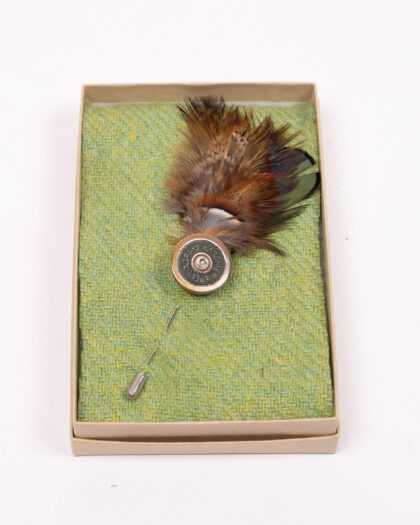 This brand new Fine Feathers lapel pin features a shotgun cartridge design paired with a real feather. The cartridge is made of metal with brass details, while the feather adds a touch of rustic charm. This lapel pin is a stylish accessory for any shooting enthusiast or anyone who appreciates unique and eye-catching accessories. It comes in a presentation box with a tweed-effect liner, making it a perfect gift.