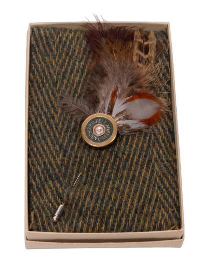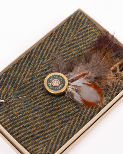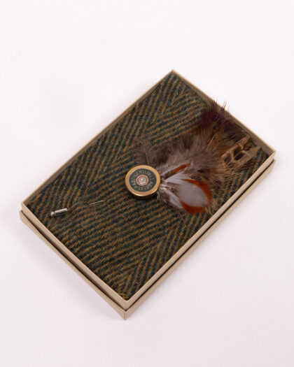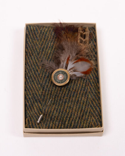 This is a brand new, stylish lapel pin from Fine Feathers. The design features a metal and brass shotgun cartridge surrounded by small feathers. The lapel pin adds a touch of rustic charm to any outfit or accessory. Perfect for adding a unique touch to a jacket, bag, or hat, making it an ideal gift for someone who appreciates shooting sports or country-inspired accessories. Its eye-catching detail will spark conversations and showcase individual style.