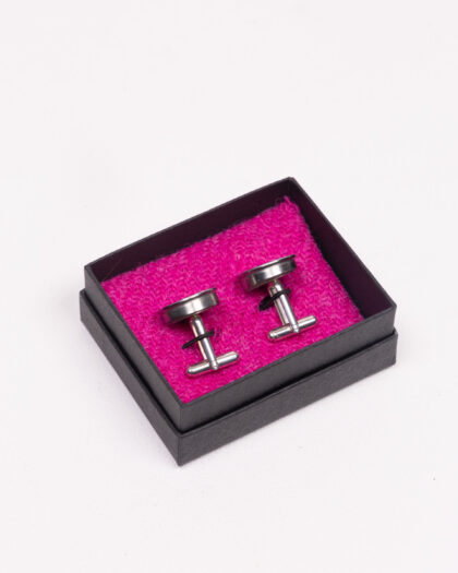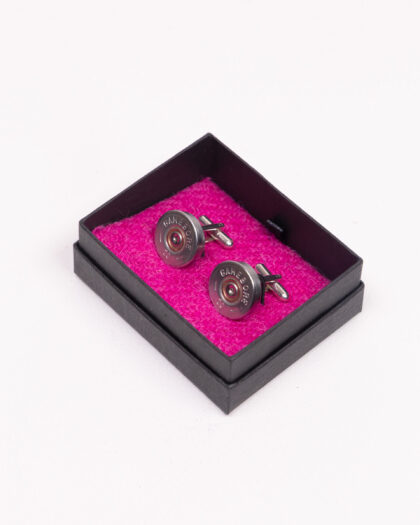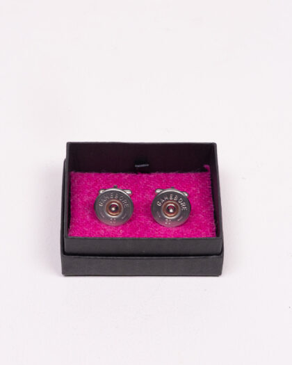 These brand new Fine Feathers cufflinks offer a touch of rugged sophistication. Fashioned to resemble the ends of shotgun cartridges, these cufflinks are silver in colour. The cufflinks are presented in a black box with a pink cushioned insert, making them a perfect gift for a special someone or a treat for yourself.