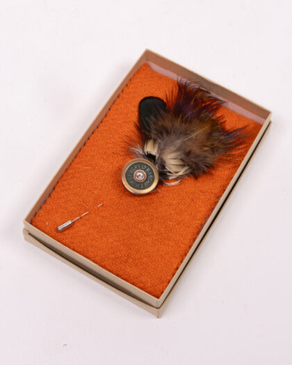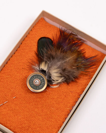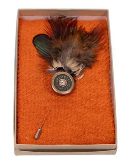 This is a brand new Fine Feathers lapel pin, featuring a unique cartridge design in silver-tone steel. The pin is embellished with brown and green feathers adding a touch of individuality and style. A perfect accessory for jackets or bags, it comes in a box making it ideal for gifting. An unusual gift idea.