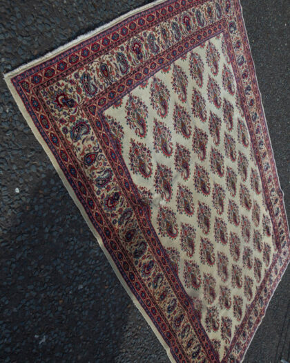 This is a vintage Persian wool rug featuring a cream coloured central field densely populated with red and blue paisley patterns. The rug has a decorative red and blue border with a repeated paisley motif. The tight knotting creates a durable surface suitable for floor use. The fringed edges are intact. Note some wear and minor discolouration consistent with age and use. Display in a living room or bedroom to add a touch of traditional Persian style.