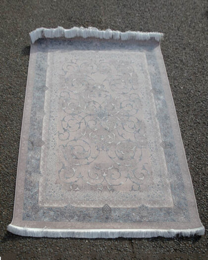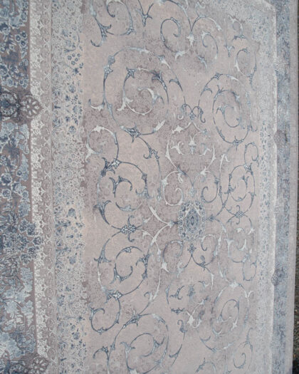 This fine woven Iranian rug features a central floral medallion surrounded by ornate borders with intricate floral and foliate patterns. The design is executed in soft grey, cream, and duck egg blue tones, creating a calming and sophisticated aesthetic.