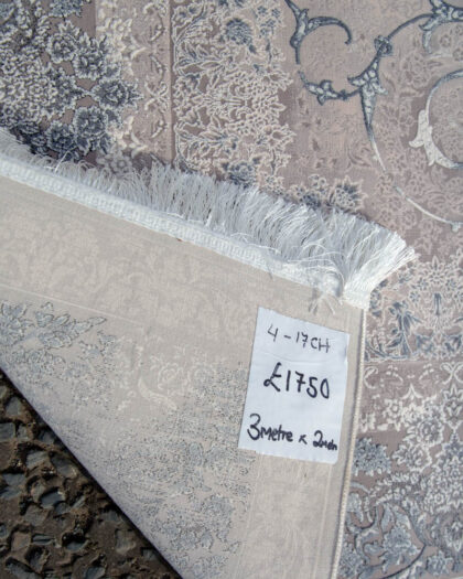 Fine woven Iranian rug with central floral medallion and ornate borders. Soft grey, cream and blue tones. Good condition. 3 metre x 2 metre.