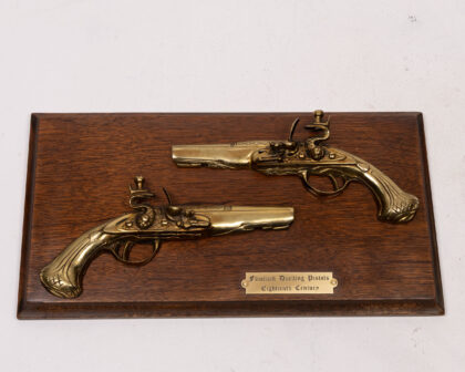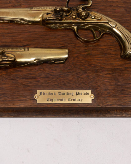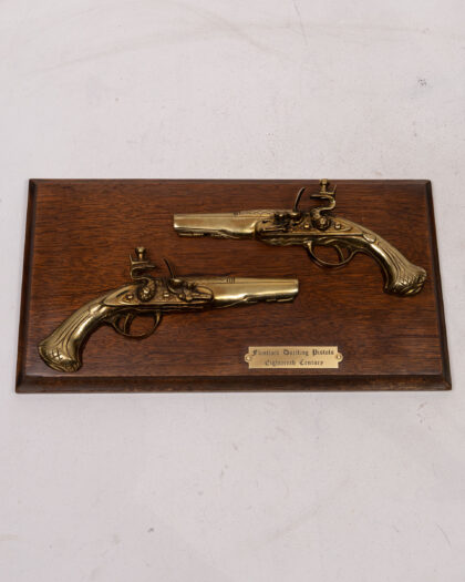 This is a decorative display plaque featuring two brass decorative halves of flintlock duelling pistols mounted on a wooden plaque. A small plaque in the centre of the wood reads "Flintlock Duelling Pistols, Eighteenth Century". The wood is a dark brown with a black painted trim surrounding the plaque. A great item for a collector, man cave or study. The plaque is in excellent condition.