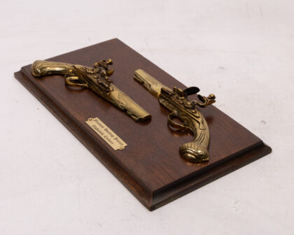 Decorative Flintlock pistol display plaque. Brass pistols mounted on a wooden display. A fantastic item for a collector!