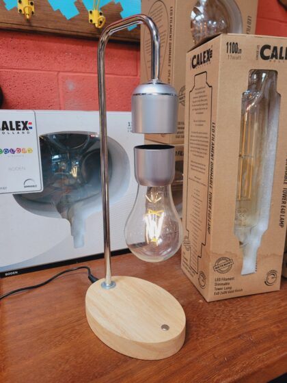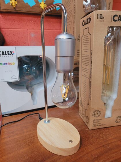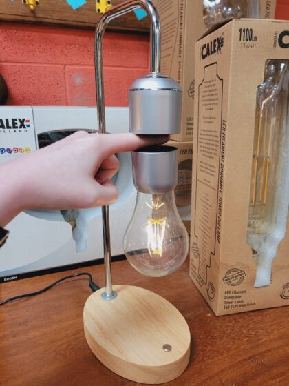A lamp where the bulb floats in mid-air, you can pass your finger through the gap! The lamp is turned off by moving the bulb towards the lamp where they stick together.