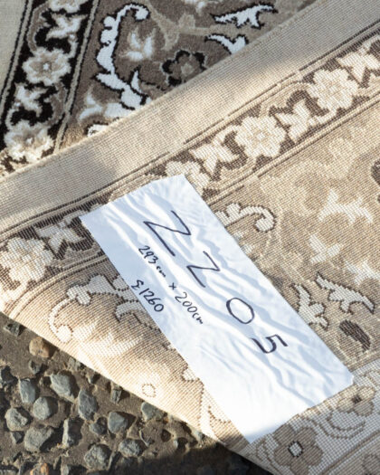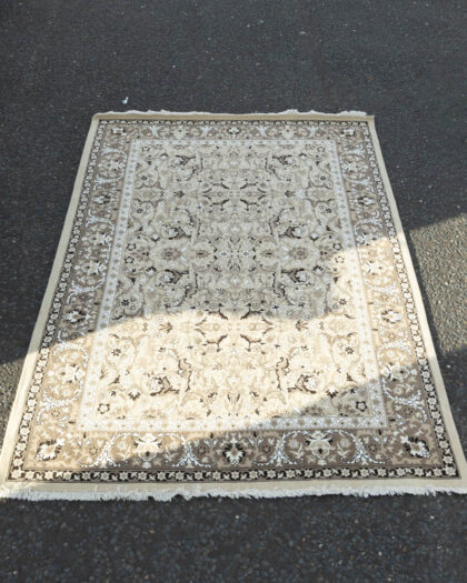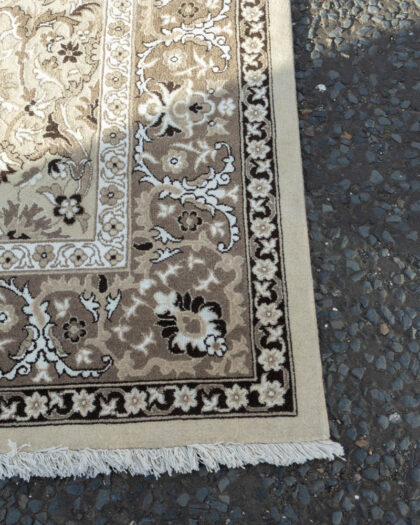 Cream area rug with brown floral design and fringed edges. Measures 293cm x 200cm. Good condition.