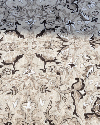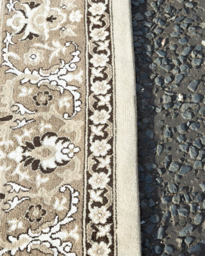 This area rug features a cream background with a repeating floral pattern in various shades of brown and white. The edges of the rug have a cream border with a brown floral design, and the rug has fringed edges. The rug measures 293cm x 200cm. It would make a nice addition to a living room, bedroom, or dining room.