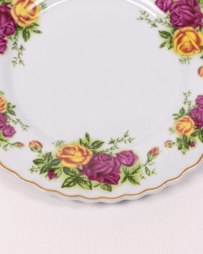 Vintage decorative plate with a white base, adorned with purple and yellow rose floral pattern and gold trim from Trade Winds Table Ware.