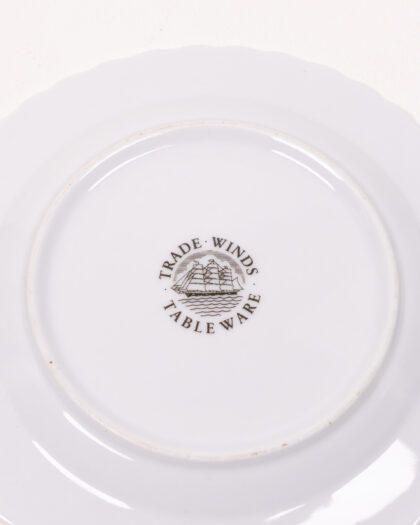 This decorative plate features a delicate floral design, with clusters of purple and yellow roses arranged around the rim. The plate has a crisp white base which beautifully showcases the colourful flowers. A gold trim adds a touch of elegance, accentuating the scalloped edge. On the reverse of the plate is the makers mark from 'Trade Winds Table Ware' . It is in good condition with no visible chips or cracks and would make a charming addition to any dining collection or as a decorative accent piece in any home. The item would be great for display.