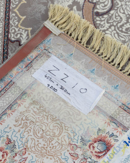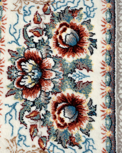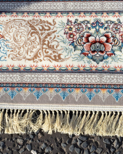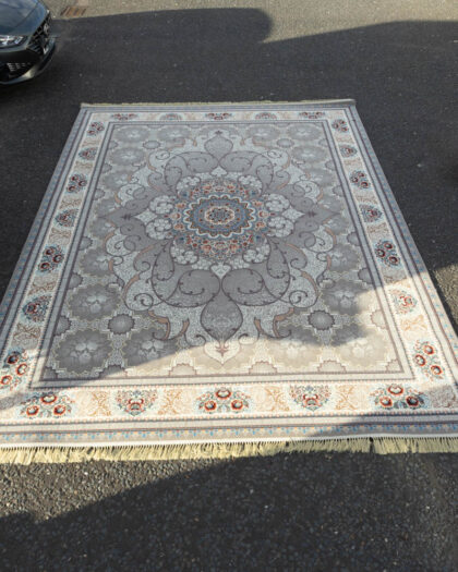 A patterned rug with a floral and scroll design in grey, cream, and blue tones. Features fringed edges. Good condition.