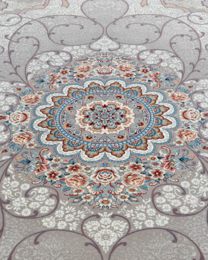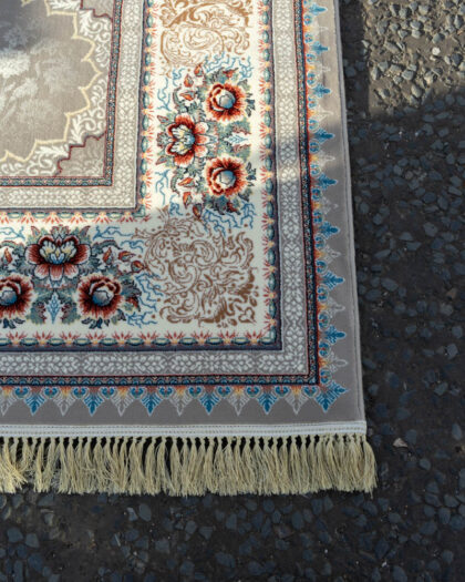 This patterned rug features a central floral medallion surrounded by scrolling patterns and floral accents. The color palette consists of grey, cream, and blue, creating a sophisticated look. Fringed edges add a decorative touch. The rug appears to be in good condition and would enhance the style of a living room or bedroom.