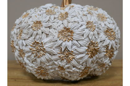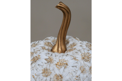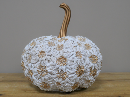 This exquisite decorative pumpkin features intricate white floral designs with elegant gold accents, perfect for enhancing your home decor. Dimensions: Height 27cm, Width 25cm, Depth 25cm. Weight: 1.3kgs.