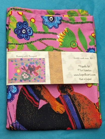 This brand new tea towel from Kapelki Art features a vibrant and whimsical design of a bunny rabbit carrying a bouquet of flowers, set against a bright pink backdrop. The design is executed in a folk art style with bold colours and graphic elements. The bunny is dressed in a smart black jacket and red boots, adding a touch of playful sophistication. The background features an array of stylised blue flowers, green foliage, and a radiant yellow sun, creating a cheerful and uplifting scene. This tea towel is made from organic cotton and is printed in England. It would make a lovely addition to a kitchen or dining area, adding a splash of colour and a touch of folk-art charm.