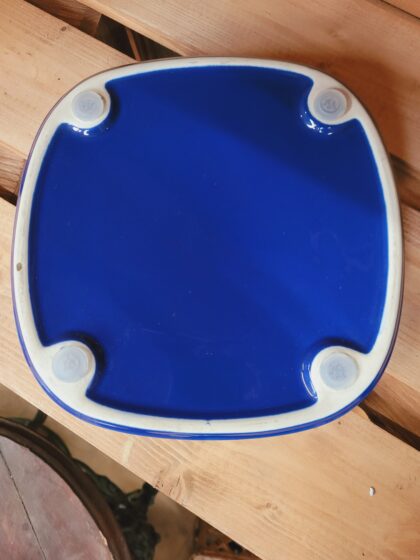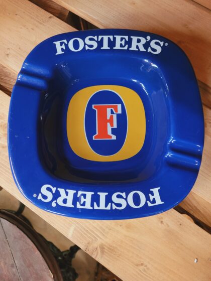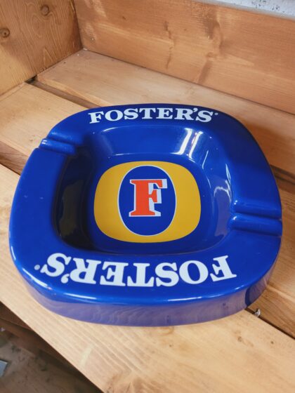A large blue glazed ceramic square ashtray. Bears white lettering which reads, "Foster's".