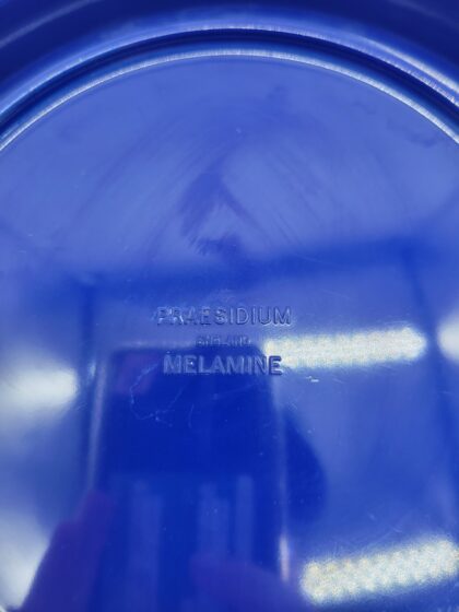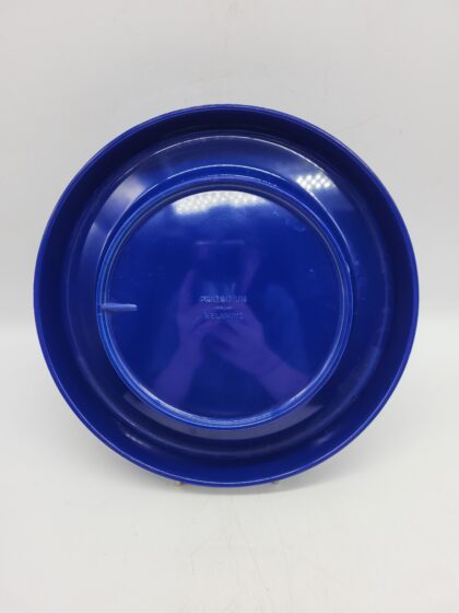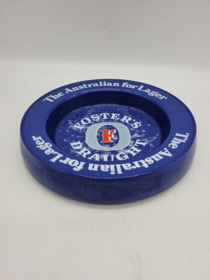 A circular blue plastic ashtray. Bears white lettering which reads, "Foster's Draught The Australian for Lager".