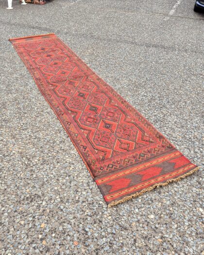 This is a decorative wool runner rug. The primary colour is red, along with black and brown. The runner features a repeated geometric pattern throughout. The edges of the rug have a fringed finish, giving it a traditional appearance. It would make a decorative addition to any hallway or living room.