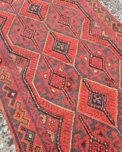 Decorative runner rug with geometric patterns in shades of red, black, and brown. Adds a cosy and colourful touch to hallways and living rooms.