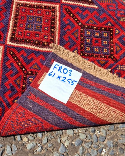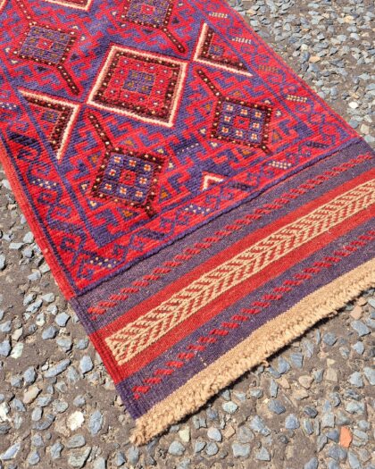 This is a handwoven Afghan Mishwani runner featuring a geometric design. The primary colours are red and blue with brown and beige accents. The runner is made of wool and has a fringe on both ends. This rug would add character to any room in the house and would be especially suitable for an entrance hall or hallway. It is in very good condition.