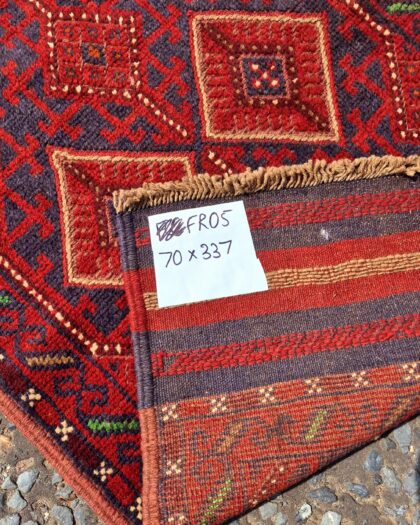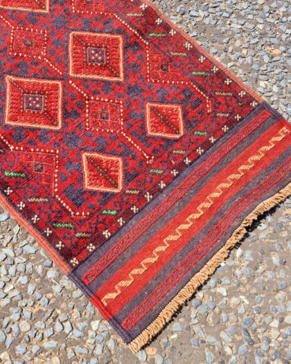 Handwoven Afghan Mishwani runner with a striking geometric pattern in red and black tones. Vintage charm and character.