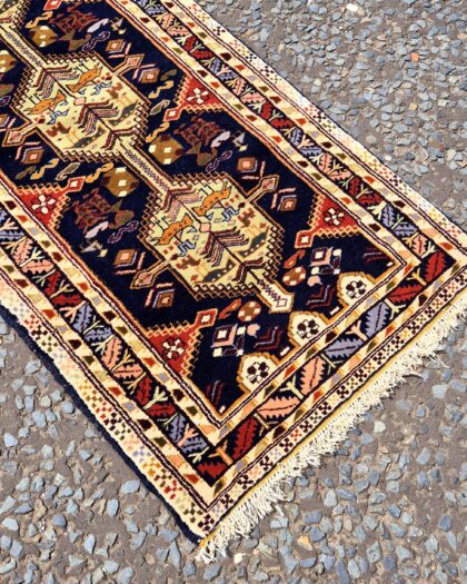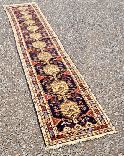 This is a beautiful Oriental runner rug, perfect for adding a touch of elegance to any hallway or narrow space. The rug features a classic design with detailed patterns in shades of blue, red and cream. It is crafted from wool, making it durable and soft underfoot. The rug is in good condition overall, with some slight signs of wear consistent with its age and use, which adds to its vintage charm. This stunning rug is ideal for those looking to enhance their home decor with a touch of timeless style.